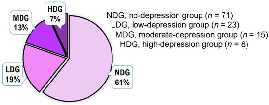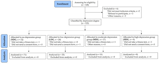 As shown in Figure 1, 122 subjects were assigned to one of four groups according to the level of depression. Of the 72 subjects who were allocated to the NDG, one did not receive a physical fitness test. Of the 24 subjects who were allocated to the LDG, one did not sign a consent form. Of the 17 subjects allocated to the MDG, one did not complete a physical fitness test, and one chose not to continue. Of the 9 subjects who were allocated to the HDG, one did not complete a physical fitness test. Finally, a total of 117 participants were included in the study.