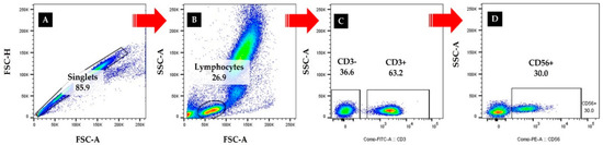 Blood samples were collected using BD vacutainer tubes (Becton Dickinson, Franklin Lakes, NJ, USA) to evaluate immunocytes after fasting for 10 h. After resting for 15 min, 5 mL of blood was collected from the antecubital vein of the subjects with a disposable syringe by a medical laboratory technologist. Blood samples were left at room temperature for 1 h and centrifuged at 1000 rpm for 15 min for the serum. After that, the immunocytes measures were conducted to evaluate the cellular immune function of the subjects, and the distribution and levels of leucocyte, T cells, and NK cells present in the subjects’ peripheral blood were confirmed. The distribution of CD3-positive T cells and CD56-positive NK cells was measured using flow cytometry [12]. Specifically, the percentage and absolute cell counts of peripheral blood cell subsets were analyzed as described below: 50 μL of blood was stained with anti-human antibodies against anti-human CD3-Fluorescein isothiocyanate (FITC; Cat No. 555339, BD) and CD56-Phycoerythrin (PE; Cat No. 555516, BD) from BD Biosciences (Franklin Lakes, NJ, USA). After incubation for 15 min at room temperature in the dark, the erythrocytes were lysed by adding 450 μL of FACS lysing solution to each test tube for another 15 min at room temperature in the dark. The variables were then analyzed using FACS Canto II (BD Bioscience) and Flowjo software (Treestar, Ashland, OR, USA) and are presented as percentages, as shown in Figure 2. Absolute cell counts of lymphocyte subsets were obtained using an automatic hematology analyzer (Sysmex Corp., Kobe, Japan).