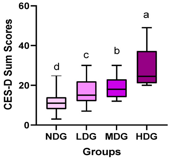 Comparative results of CES-D sum scores among four groups. Symbols a, b, c, and d represent post hoc results from Bonferroni test.