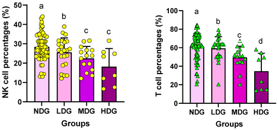 Differences of NK cells and T cells between the groups. Symbols a, b, c, and d represent post hoc results from Bonferroni test.