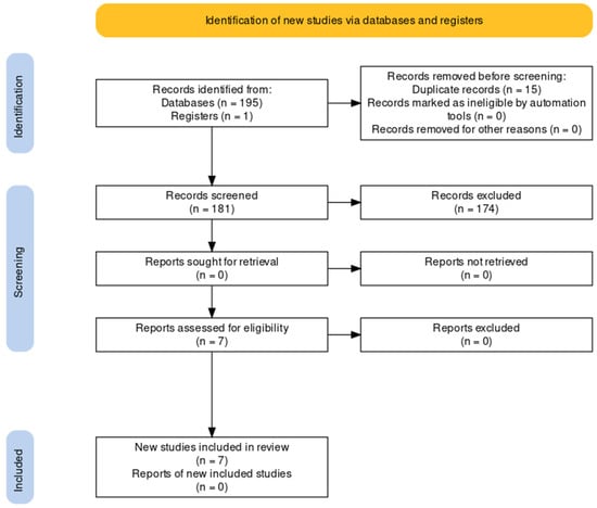 The search of the included databases (PubMed, Scopus, Cochrane Library, ScienceDirect, Web of Science) identified 195 records imported into the reference management program EndNote 20. We also conducted a hand-searching of the grey literature, and we identified one record. With the help of this program, we identified and eliminated 15 duplicates. The remaining search records (n = 181) were imported into an Excel 2016 file, where two authors (S.K. and S.F.) independently reviewed titles and abstracts. Those unrelated to our study’s topic and that did not meet the inclusion criteria (n = 174) were excluded. Ninety-nine studies found by the search did not investigate the effect of probiotics on depression during pregnancy or in the postnatal period and 53 studies did not display the effect of probiotics on the occurrence of depression during pregnancy or in the postnatal period. Twelve studies included participants, other than pregnant women or women during the postnatal period, three studies were not in English, Slovene, or German and seven papers were not clinical trials.