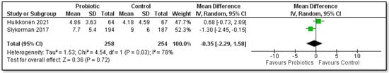 A meta-analysis of two trials [48,49] involving a total of 512 women consuming probiotics during pregnancy and up to 6 months after birth was conducted to assess the outcome of EDPS depression scores at 12-months postpartum (Figure 2). The results showed no statistically significant difference between the probiotic and placebo groups (MD −0.35, 95% CI −2.29 to 1.58; I2 = 78%). However, the results show high heterogeneity (I2 = 78%) as the study by Slykerman and co-authors [48] included women with healthy pregnancies, whilst the study by Hulkkonen et al. and co-authors [49] included overweight pregnant women.