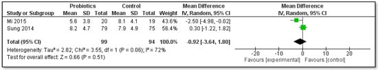 The meta-analysis for the outcome of the EPDS depression scores of the mothers of infants consuming probiotics in two studies by Mi and co-authors [62] and Sung and co-workers [64] was also conducted (Figure 3). A total of 193 mothers were assessed after four weeks of supplementation of infants in order to treat infant colic, but no statistical difference was found between both groups MD −0.92, 95% CI −3.64 to 1.80; I2 = 72%). In both studies the infants received the same probiotic strain Limosilactobacillus reuteri DSM 17938 for one month; however, the infants in the Australian study by Sung and co-authors [64] were slightly older (mean age 7.5 weeks at beginning of the study) than the infants in the Chinese study (mean age 29.7 days) by Mi and co-authors [62].
