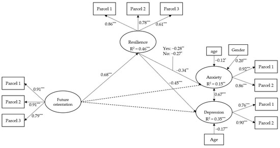 We used SPSS 26 software to run the preliminary statistical analyses. First, we performed descriptive statistics and Pearson correlation analyses on the research variables of the study. Gender and age were included as covariates in all the statistical analyses to check the effects on anxiety and depression [11]. Given the properties of the constructs, solutions based on item parcelling rather than on individual items are more appropriate to reduce the risk of convergent problems and improve model fits [44,45]. The item parcelling was generated by applying a balanced procedure designed to combine high and low inter-correlation values [46]. Therefore, we consistently used three indicators for each of the four constructs for future orientation and resilience and two indicators for anxiety and depression, respectively. Then, as the first step in the structural equation model (SEM), the measurement model for the latent constructs was tested. Furthermore, we tested the full (measurement and structural) model. In the last step, to test the study’s hypotheses, mediation and moderation analyses were conducted using Mplus 7.01 [47]. The models were estimated with the maximum likelihood parameter, with standard errors and a mean-adjusted chi-square test statistic robust to non-normality (MLM). The MLM chi-square test statistic is also referred to as the Satorra–Bentler (S-B) chi-square. The fit of the tested models was assessed using the following multiple indexes: (a) a comparative fit index (CFI) ≥ 95, (b) a Tucker–Lewis Index (TLI) ≥ 95, (c) a root mean square error of approximation (RMSEA) ≤ 06, and d) a standardized root mean square residual (SRMR) < 08 [48]. Finally, a multigroup moderation analysis was performed, and comparisons were made by computing χ2 difference (Δχ2).
