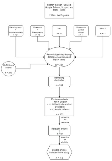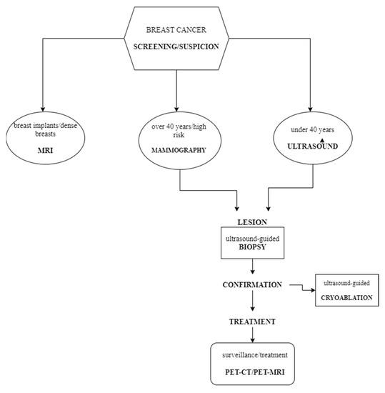 - Jafari, S.H.; Saadatpour, Z.; Salmaninejad, A.; Momeni, F.; Mokhtari, M.; Nahand, J.S.; Rahmati, M.; Mirzaei, H.; Kianmehr, M. Breast Cancer Diagnosis: Imaging Techniques and Biochemical Markers. J. Cell. Physiol. 2018, 233, 5200–5213. [Google Scholar] [CrossRef] [PubMed]
