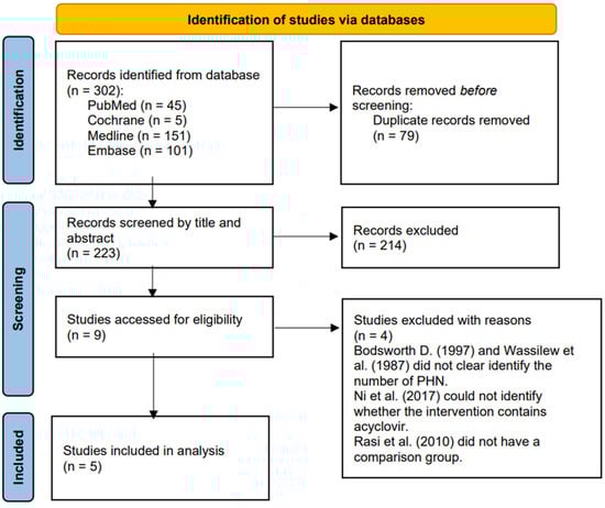 Figure 1 presents the process by which we identified 302 relevant studies in the four databases. After removing the duplicates, we screened 223 studies based on the titles and contents of the abstracts and excluded 214 that did not meet our inclusion criteria, leaving nine for further evaluation [43,52,53,67,75,76,77,78,79]. After examining the full texts of these articles, we excluded four clinical trials [50,76,77,80] because of a lack of a comparison group or of clarity regarding the number of PHN patients who received acyclovir. The five remaining studies included four double-blind RCTs [52,53,67,78] and one comparative randomized clinical study [80] that we subjected to further analysis. Supplementary Table S2 presents the characteristics of these five studies.