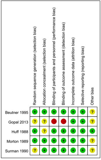 Four of the five studies had a randomized double-blind design, the exception being that by Gopal et al., which had a comparative randomized clinical design [78,80]. Supplementary Table S3 and Figure 2 present the risk of bias in the five studies. Of the cells in the included studies, 22.86% were rated as having an uncertain risk of bias in the main dimensions of assessment of risk of bias (Figure 2). We rated only one study as having a high risk of bias in the blinding procedures [80]. The studies by Gopal et al. (2013) and Surman et al. (1990) involved a double-blind procedure, though these researchers did not specify their methods for generating the random sequences, and neither Gopal et al. (2013) nor Huff et al. (1988) specified their technique for allocation concealment. Surman et al. (1990) reported the number of participants who dropped out of the trial but without indicating the group or groups to which those who did so belonged. Among the potential biases in the other four studies, the participants in one were outpatients [52], three included participants who were receiving other treatments [67,80], and one included participants who continued taking their current medications [78]. We reasoned that the failure to exclude such participants may have resulted in underestimation of the effects of the interventions. Additionally, the participants in two of the studies were asked to report the development of PHN over the entire follow-up period [53,67]. Because Beutner et al. (1995) assessed pain based on the participants’ daily records, their results may have been subject to recall bias in the collection of data relating to adverse events, therefore introducing an error into the inferences drawn from the results.