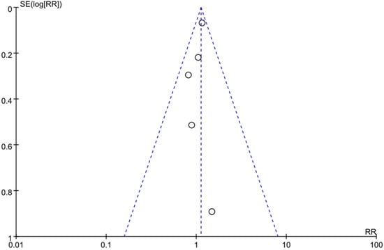 The funnel plot of current studies. The circle presents the risk ratio and standard error (SE) of the log RR of each study.