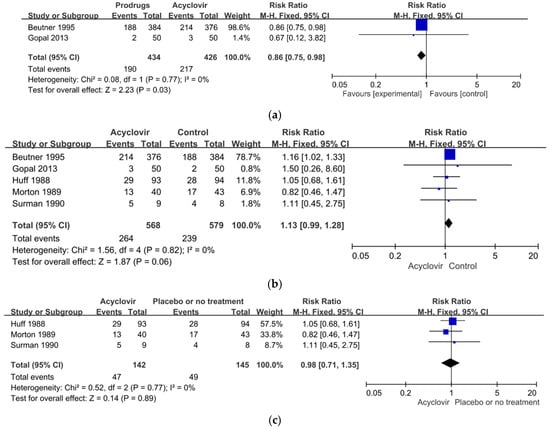 Three of the studies, involving 287 participants in all, compared the effects of acyclovir with the administration of a placebo [53,67,78]. The results of our meta-analysis showed that the incidence of PHN events for the participants who received acyclovir was lower than for those who received the placebo or no treatment (RR = 0.98, 95%, CI: 0.71 to 1.35, p = 0.89), but the difference was not significant. In other words, again, acyclovir did not prevent PHN within one month after the onset of the rash. The results of a heterogeneity assessment showed no significant heterogeneity among these three studies (χ2 = 0.52, p = 0.77, I2 = 0%) (Figure 4c).