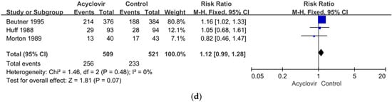 Overall, then, we found no significant heterogeneity in our meta-analysis of the effectiveness of acyclovir in relieving PHN within one month after the onset of the acute herpetic rash. We excluded two of the five studies from this analysis because of a high or an uncertain risk of bias [78,80] and conducted a sensitivity analysis on the other three, which had a low risk of bias [52,53,67]. The sensitivity analysis found no significant difference between the groups that did and did not receive acyclovir (RR = 1.12, 95%, CI: 0.99 to 1.28, p = 0.07). The results of a heterogeneity assessment also showed no significant heterogeneity among the studies (χ2 = 1.46, p = 0.48, I2 = 0%) (Figure 4d).