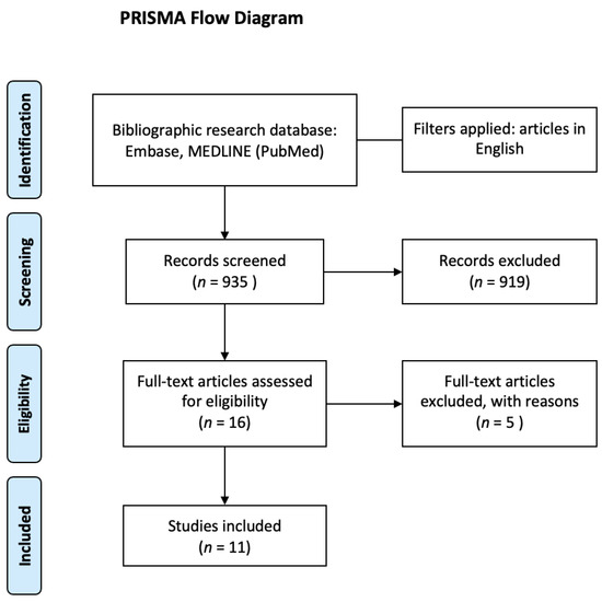 Our search yielded 935 unique records, of which 16 remained after screening titles and abstracts. We reviewed the full texts of these studies for eligibility and excluded five studies (three articles were in Chinese, and two articles were not available). Finally, 11 studies were included (Figure 1), covering a total of 418 participants (230 patients and 188 healthy participants).