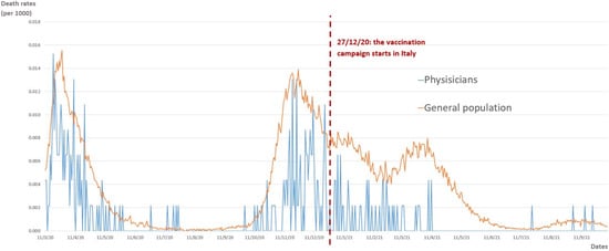 The peak of daily deaths was first reached among physicians on the 19th of March 2020, with seven doctors who died on this day, while, for the general population, the peak was reached after nine days, with 927 daily deaths. The curve of the daily deaths among physicians resembles the curve of the whole Italian population, approximately until the first ten days of January 2021, and then a relevant decrease in the doctors’ mortality rate was observed, with a significant deviation from the curve of the general public’s death trend up to the end of the summer 2021 (Figure 1).