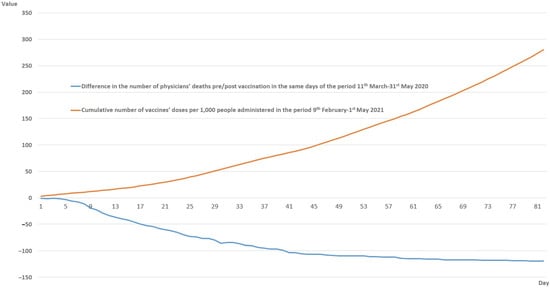 Finally, in Figure 3, an inverse correlation (r = −0.83) between the increasing difference in the cumulative number of physicians’ deaths between the same days in 2020 vs. 2021, from the 11 March to the 31 May, and the increasing number of vaccine doses administered in Italy can be observed. However, it should be noted that, as explained in the Section 2, the cumulative number of vaccine doses refers to 30 days before. The difference in the number of deaths rapidly increased up to 100 cases at the end of April, and then increased slowly up to 120 in May. On the other hand, the cumulative number of vaccine doses in Italy constantly increased during the observation period, with an upwards trend. During the first day (i.e., the 9 February 2021, which is the date that we compared with the deaths registered on the 11 March), we collected data of a total of 2.75 doses administered per 1000 people, reaching a value on the 1 May of 280.31 doses per 1000 inhabitants (Figure 3).
