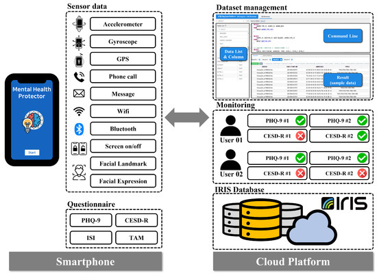 The proposed system collected multimodal smartphone data from 209 Korean mental patients between 19 August and 2 October 2021. However, out of a total of 209 participants who stated their intention to participate in the experiment, a total of 103 participants were eliminated for various reasons, such as quitting during the study, missing sensor data, and failing to complete a self-reported questionnaire. Consequently, we conducted the study using data from 106 participants. We developed the Android-based “Mental Health Protector” application to collect various data from smartphones. The application was used to collect passive sensor data including GPS, Screen On/Off, Call logs, and SMS logs, Activity Transition, Facial expression features, etc., and survey response data including the Patient Health Questionnaire-9 (PHQ-9) [15], Center for Epidemiologic Studies Depression Scale-Revised (CESD-R) [16], The Insomnia Severity Index (ISI), and Technology Acceptance Model (smartphone use, app use). In the proposed system, ’IRIS’, a cloud-based big data platform, was used to collect and store big data. Finally, the proposed derived features were extracted from the collected data to predict depression in the user. The proposed system is represented in Figure 1.