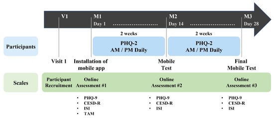 Data Collection Procedure. Among psychiatric outpatients, the data collection procedure was informed to users who agree to participate in the study (V1). When the application installation was completed, data were collected for two weeks (M1–M2) after conducting a survey related to the user’s demographic information and mental health (M1). After the first data collection period, a middle test (M2) was conducted, and the second data collection (M2–M3) was performed for two weeks again. When the second data collection is completed, the final test (M3) was conducted, and the participant’s role in the study ended.