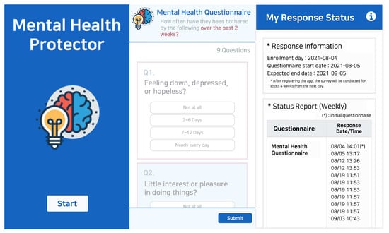 User Interface of “Mental Health Protector” application. The image shows a part of the data collection application titled “Mental Health Protector” execution screen. The image on the left depicts the initial execution screen, the image in the center depicts the screen that responds to the survey, and the image on the right represents the screen that can check the response status.