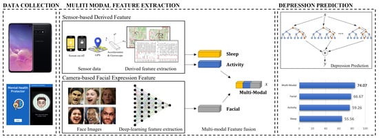 Wang et al. [6] proposed a system for collecting mobile sensor data and self-report questionnaire data from smartphones for 48 college students, showing significant prediction of depression through the system. In addition, based on the prediction of depression through smartphones, many studies have proposed various derived feature design methods related to depression. Colbaugh et al. [7] predicted depression by measuring the amount of activity through GPS and WiFi data. Ware et al. [8] used metadata obtained from an institution’s WiFi infrastructure beyond GPS and WiFi data for college students to predict depression. In addition, existing studies [9,10] confirmed that the derived features related to depression through sensor data showed a correlation. Furthermore, many studies have used additional devices such as smartwatches beyond smartphones to collect more sophisticated and diverse sensor data. Narziev et al. [11] predicted depression by estimating five symptoms from data collected from smartphones and smartwatches for four weeks in 20 ordinary people. Wang et al. [12] predicted depression by designing features for poor concentration and depressed mood using smartphones and smartwatches for 83 college students. In summary, related studies design derived features associated with DSM-5-defined depressed symptoms using smartphone data. However, existing papers often have a small number of recruiters for gathered datasets [13,14]. Moreover, since datasets are collected for ordinary people, it often has a “data imbalance” problem in which participants with depression have extremely few [8]. In addition, research involving extra devices, such as wearable devices, is difficult to implement in regular activities.
