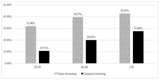 The uptake rate of vision and cataract screening was 37.00% and 17.80%, respectively. The age-specific uptake rates are shown in Figure 1. Specifically, among residents aged 50–59, 31.90% of them had taken vision screening, but only 10.71% had received cataract screening. The vision and cataract screening uptake among residents aged 60–69 was 39.57% and 20.05%, respectively. Among residents aged 70 and older, 42.63% of them had done vision screening, but only less than one-third (27.60%) had taken cataract screening. In short, the uptake rate of services for vision and cataract screening increased with age but remains fairly low.