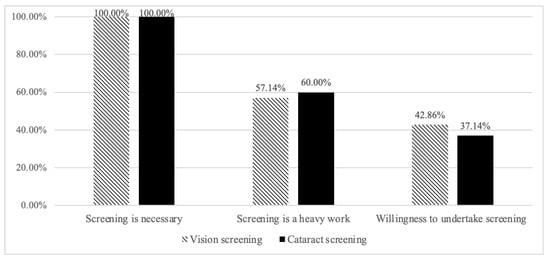 We further investigated VDs’ willingness and attitudes towards providing eye care services. Figure 2 shows that all VDs thought that vision and cataract screening were necessary. However, most VDs thought that vision (58%) and cataract screening (60%) were heavy work. When asked about their willingness to screen, only 46% and 37% of VDs were willing to undertake vision and cataract screening.