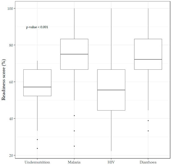 The percentage score of service readiness differed depending on the service; it was highest for malaria (median (IQ): 75.0 (66.7 to 83.3)), followed by diarrhea (median (IQ): 72.2 (66.7 to 83.3)), nutrition (median (IQ): 57.1 (52.4 to 57.1)) and then HIV (median (IQ): 55.6 (44.4 to 66.7)), at p < 0.001, with malaria being considered intermediate and all other services considered low (Figure 1).