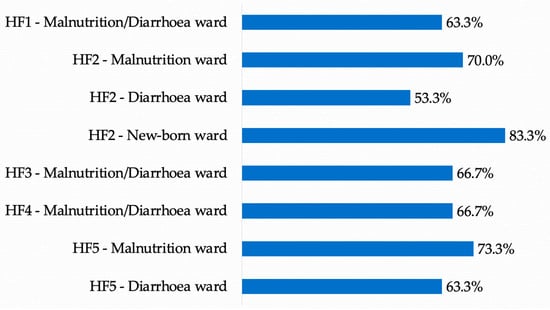 Considering the nutrition service readiness assessment conducted in 2021 (NSA, 2021), the results pointed to hospitals’ diarrhea wards scoring lowest on readiness for undernutrition services. Higher readiness for nutrition services was observed in nutrition-dedicated wards and in new-born wards. Based on the bidirectional relationship observed between nutrition and diarrhea in children under five, the ideal was for both services to be considered ready for nutrition services, or with readiness percentage scores that were approximately the same [18,19]. Better nutrition service readiness in diarrhea wards would allow every child with diarrhea to be assessed for undernutrition and avoid clinical complications and increased costs to the health system [23,24,57].