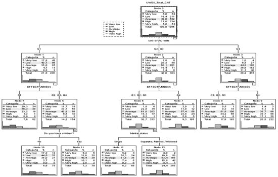 Job satisfaction is presented as the most significant variable with respect to the UWES-9 test score. Participants with lower satisfaction give low or very low test scores in 58.5% of the cases, while among those with higher satisfaction, give a high or very high total score (47.7%). Low satisfaction and feeling that one does not have sufficient resources for effective work (7.6% of cases) translates into 75.6% low or very low test scores. For those with low satisfaction and more resources for an effective job, the score is higher, but conditioned by whether or not they have children. If they do not have children (6.9%), low scores stand out, while those who have children (7.3%) score with mean values. For those participants with intermediate satisfaction (40%), the test score is mediated, as in the previous case, by resources for effective work and when these are not high by marital status; however, in all cases, the category with the highest proportion of cases is the mean, with a slight asymmetry to the left in the case of fewer resources for an effective job and being single. Finally, higher satisfaction and more resources lead to 55.8% of the participants scoring high or very high in the test, 38.7% intermediate, and the remaining 5.5%, low or very low (Figure 1).