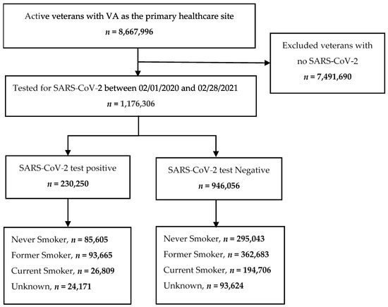 We conducted a retrospective cohort study to investigate the impact of smoking on testing positive for SARS-CoV-2 infection using the VA COVID-19 Shared Data Resource, established to collect COVID-19 infection data and facilitate research. This domain contains specific, curated information for patients seen at VHA medical centers and tested for SARS-CoV-2 infection since February 2020 [13]. Patients were eligible if they were (1) unvaccinated, (2) tested for SARS-CoV-2 infection between 1 February 2020 and 28 February 2021, and (3) had at least one encounter (inpatient or outpatient visit) at a VHA facility over 2 years, from January 2019 to December 2020. Patients were excluded if they did not have at least one encounter during that period. We identified 1,176,306 veterans who were tested for SARS-CoV-2 infection that met the inclusion criteria (Figure 1). We defined the index date as the date of the first positive or negative SARS-CoV-2 test. The study was approved by the Baylor College of Medicine Institutional Review Board (H-47595) and the Michael E. DeBakey VA Medical Center Research and Development Committee.