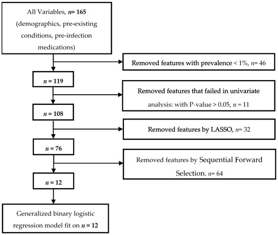We illustrate the process of the most important variable selection in Figure 2, as previously described [6]. We sequentially used a cascade of machine learning approaches in four steps to identify the most important predictors for a positive SARS-CoV-2 test using both imputed and unimputed datasets. The variables were curated from the full breadth of EMR (i.e., demographic, clinical, pre-existing conditions, and pre-infection medications). We started with 165 initial variables. First, we removed any variable with a prevalence of less than 1%, and this step reduced the dimensionality to 119 variables. Second, a univariate filter method (a chi-squared test used to evaluate the significance of each independent variable to the target variable) excluded variables not statistically associated with testing positive for SARS-CoV-2 infection at p < 0.05. We retained 108 variables. Third, we applied an embedded method, the least absolute shrinkage and selection operator (LASSO) [18], with 10-fold cross-validation to select the most important variables; this step kept 76 variables. LASSO is a regression model that adds shrinkage (regularization penalty) to shrink the coefficients of less contributory variables to zero. The 10-fold cross-validation split the dataset into ten equal parts. Nine parts were used for training and one part for validation. The process was repeated ten times. The variables that were retained most frequently in predictive models for SARS-CoV-2 infection were selected as the most important variables. Finally, we applied a wrapper method, the sequential forward selection (SFS) variable with a five-fold cross-validation. This final step selected 12 variables. SFS starts with an empty set of variables, then it identifies the best variable (associated with the best performing single regression model based on a p-value selection criterion); next, it evaluates all possible models (pairs) of the best variable and each of the remaining variables and selects the best pair. It sequentially adds a new variable to the preselected variables until the variable addition does not reduce the criterion-value by less than 0.05. The full lists and set of variables selected at each step are presented in Supplementary Materials (Table S2a for imputed data and Table S2b for unimputed data). The analysis of unimputed data after removing patients with unknown smoking status provided an identical list of features at each step.