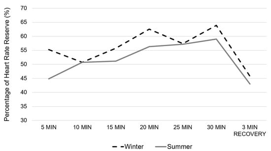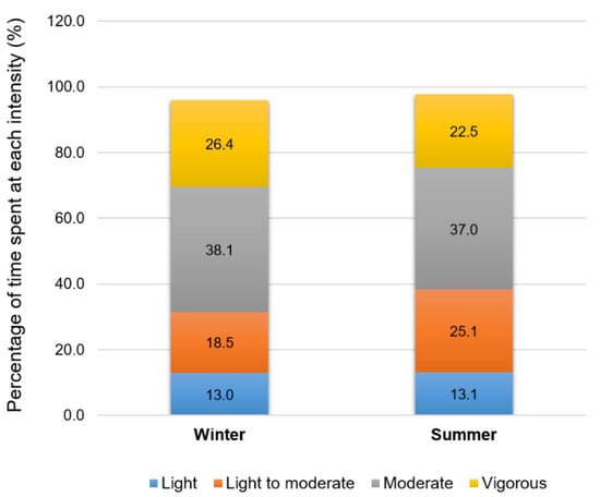 Figure 2 illustrates the time spent at each intensity according to the American College of Sports Medicine’s (ACSM) cut-offs using the %HRR. The time spent at a light (p = 0.9676), light to moderate (p = 0.2973), moderate (p = 0.8946), and vigorous intensities (p = 0.6846) were not significantly different between seasonal conditions.