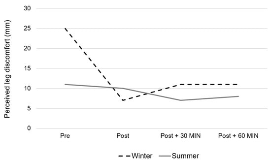 The participants’ perception of temperature, fatigue, anxiety, mental and physical well-being, and leg discomfort were also assessed before, after, 30 min, and 60 min after the session using 150-mm visual analog scales. The questions were for fatigue: “how tired do you feel right now?”—0 being not tired at all and 150 being exhausted; for anxiety: “how anxious do you feel right now?”—0 being not anxious at all and 150 being completely anxious; for mental well-being: “how mentally relaxed do you feel right now?”—0 being not mentally relaxed at all and 150 being completely mentally relaxed; for physical well-being: “how physically relaxed do you feel right now?”—0 being not physically relaxed at all and 150 being completely physically relaxed; and for leg discomfort: “how painful are your legs right now?”—0 being not painful at all and 150 being really painful. The rate of perceived exertion was also evaluated at the end of the training using a 0 to 10 scale; 0 meaning no perceived exertion at all and 10 corresponding to such a difficulty that the participant had to stop.