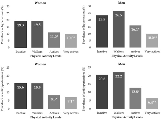 When analysing the use of antihypertensive drugs in relation to the PAL, no differences were found between men and women in the groups of Inactive and Walkers and between these two groups for the entire population. Only in the Very Active group are differences between men and women. The Active and Very Active groups differ from the other groups in the prevalence of drugs use. According to Pescatello et al., the PA effects on the prevalence and use of antihypertensive drugs should be analysed through the study of the BP response to an exercise training intervention ranging from low to vigorous intensity [30]. Several meta-analyses of a randomized controlled trial examined the BP response to an exercise training intervention ranging from low to vigorous intensity among adults who were physically inactive at baseline and with hypertension [48,50,51,52,53,54,55,56,57,58,59,60,61,62]. They reported a significant reduction in BP. The magnitude of the BP reductions ranged from 5 to 17 mmHg for SBP and 2 to 10 mmHg for DBP. There seems to be strong evidence that low to vigorous PA reduces BP among adults with hypertension. In a meta-analysis by Pescatello et al., an association is reported between high amounts (i.e., volume and/or intensity) of leisure-time PA with a 19% decreased risk of incident hypertension compared to the group that engaged in low amounts of leisure-time PA (relative risk (RR) = 0.81, 95% CI: 0.76–0.85) [30]. It is further noted in Pescatello et al., that moderate amounts of leisure-time PA was associated with an 11% decreased risk of hypertension compared to the group that engaged in low amounts of leisure-time PA (RR, 0.89, 95% CI: 0.85–0.94) [30]. According to Bakker et al., even small amounts of PA seems to be related to lower risk of hypertension, whereas higher levels of PA and cardiorespiratory fitness could promote a decrease to the risk of hypertension [49]. Pescatello et al. concluded that PA seems to be related to BP reduction among adults with prehypertension and hypertension [30].