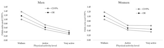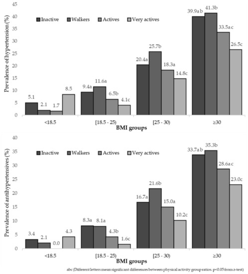 However, there is a dose–response relationship between the PAL and incident hypertension [62,63]. Liu et al. quantified the dose–response relationship between PA and incident hypertension (BMI adjustment as a covariate) and found it to be linear. Although most dose–response studies are based on self-reported PA data measured by self-reported questionnaires, there seems to be strong evidence on the inverse dose–response relationship between PA and incident hypertension [63]. The findings of our study show that in the Active (13.5%) or Very Active (10.0%) group there was significant lower prevalence (p < 0.05 in z-test) compared to Inactive and Walkers (21.2% and 22.4%, respectively). In fact, the use of antihypertensive was lower in the Very Active group (6.6%) than in Active group (10.6%), and than in Inactive people and Walkers (17.9% and 18.3%, respectively).