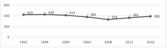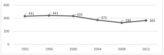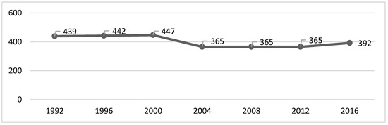We can verify that the peak of each of the analysed variables occurred in 1996, except for the gold medals, which had their peak in the year 2000 (Table 1 and Figure 1, Figure 2, Figure 3 and Figure 4). After that, there was a decrease until the PG of 2008, as the number of gold and silver medals has been increasing since then, although far from the values previously achieved (Table 1 and Figure 1, Figure 2, Figure 3 and Figure 4).