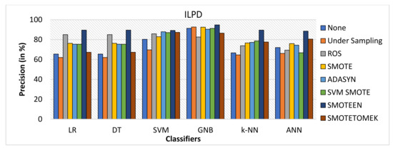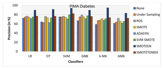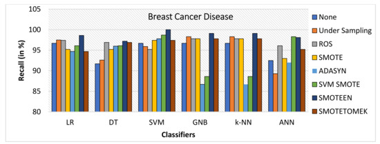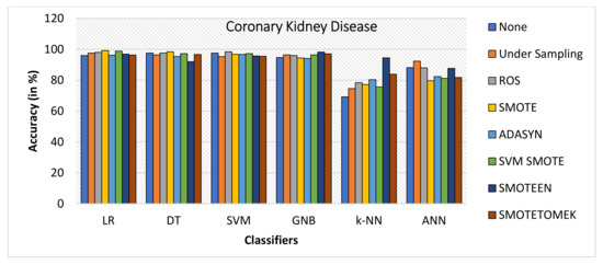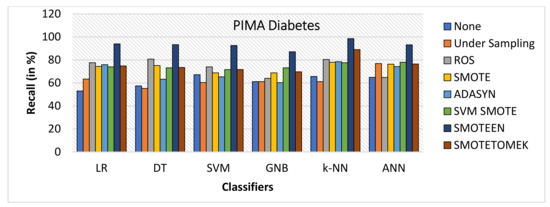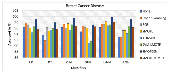 - SMOTE gives the highest value of Accuracy, i.e., 99.2% on LR and 98.4% on DT, while ROS gives the highest value of 98.4% on SVM model, SMOTEEN gives the highest value 98.2% over GNB, 96.9% over LR, 95.7% over SVM, and 94.5 over k-NN, respectively (refer to Figure 14).