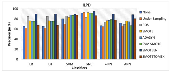 - ROS as compared to the other six data-balancing techniques shows better precision for GNB, DT, LR, SVM, ANN, and k-NN with 100%, 99.2%, 99.2%, 99.2%, 98%, and 90.8%, respectively.