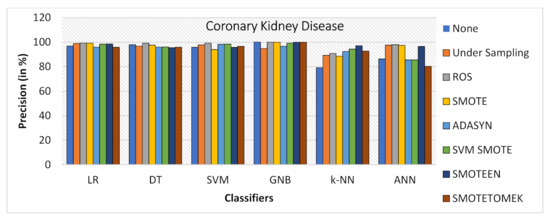 - Recall for the kidney disease dataset is highest for SMOTE over LR (99.2%), DT (99.2%) and SVM (100%) (Refer to Figure 16) machine learning models, but recall value is highest for undersampling technique over GNB, Highest for SMOTEEN over k-NN and ANN gives the best result over imbalanced data without any balancing technique.