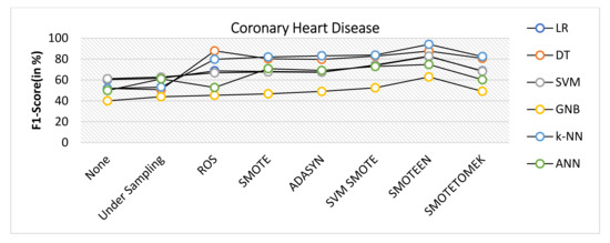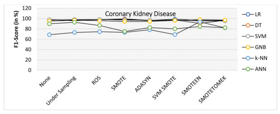 - F1 score for all machine learning techniques with SMOTEEN as a balancing technique also gives a high recall value of 88.1% for both k-NN and DT (refer to Figure 12), whereas LR, GNB, and ANN give a poor performance with low F1-score values, i.e., 84.5%, 83.4%, and 78.4%, respectively (refer to Figure 13).