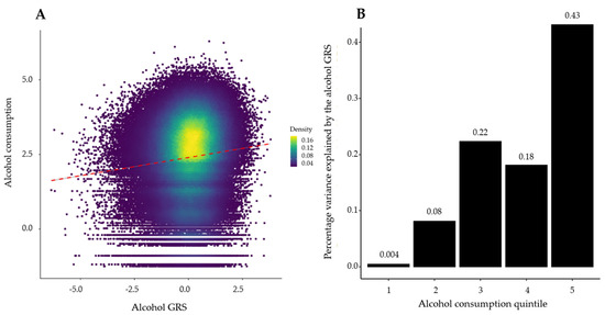 Relationship between the alcohol genetic risk score (GRS) and daily alcohol consumption. (A) Scatterplot illustrates the relationship between alcohol consumption (on a natural logarithm scale) and alcohol GRS. The red dotted line shows the gradient of the fitted regression line. (B) Percentage variation in alcohol consumption explained by the alcohol GRS (adjusted R2 estimate) within alcohol consumption quintiles. Quintile 1: 0 to 3.65 g/day; Quintile 2: 3.6–10.7 g/day; Quintile 3: 10.7–17.9 g/day; Quintile 4: 17.9–31.3 g/day; Quintile 5: 31.3–964.5 g/day alcohol consumption.