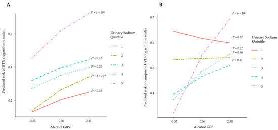 Effect of the alcohol genetic risk score (GRS) on (A) hypertension and (B) cardiovascular disease across urinary sodium excretion quintiles. X axis shows the median values of GRS in GRS quintile 1, 3, and 5, respectively: −3.549, 0.058, and 2.312.