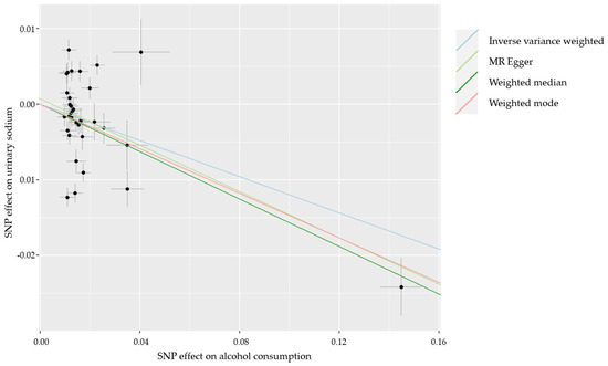 Two-sample MR for the relationship between alcohol consumption and urinary sodium. Lines represent regression line for various MR tests used. Black dots with cross represent each SNP. Effect of SNPs on alcohol consumption and urinary sodium are in the logarithmic scale. SNP, single nucleotide polymorphism; MR, Mendelian randomization.