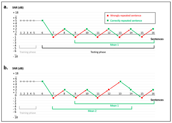 The noise level is fixed at 60 dB. The speech level is initially set at 65 dB, corresponding to an SNR of +5 dB (thus favorable). It remains fixed for the first 5 sentences corresponding to the training phase which is excluded from the scoring. This phase conditions the patient to listen in noise. From the 6th sentence onwards, each correct or incorrect answer lowers or raises the SNR by 6 dB, respectively, following an adaptive procedure. At the first reversal, a 3 dB step size is then applied. With each correct answer, the speech signal is decreased by 3 dB, while each wrong answer increases the SNR by 3 dB. The extracted SRT50 is calculated after a minimum of eleven sentences tested after the training phase. If the SNR fluctuations are within a 3 dB SNR variation range, the mean SRT50 value is calculated based on the last eight intensity levels presented. The mean SRT50 value is rounded up for decimals greater than or equal to 0.5 (Figure 1a). If the SNR fluctuations exceed an SNR variation range of 3 dB, two mean values are calculated and compared to ensure the stability of the measurement. The first mean value (mean 1), calculated on the last eight intensity levels presented (items 9 to 16), is compared to a second mean value (mean 2), calculated on eight consecutive intensities with a shift of two items (items 7 to 14). If the two rounded mean values are identical, the test stops. If the two mean values have a difference of more than 1 dB SNR, the test continues until mean 1 and mean 2 are identical (Figure 1b).