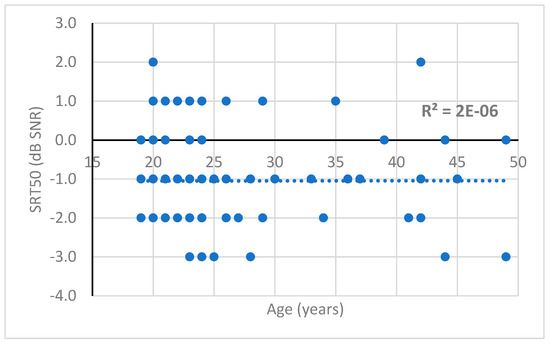 The distribution of SRT50 scores obtained in the binaural free-field listening condition was plotted according to age and sex. The unpaired t-test found no significant difference between male and female participants (p = 0.58; Table 4). Moreover, no correlation was found between the SRT50 score and age (p = 0.65, Figure 2).