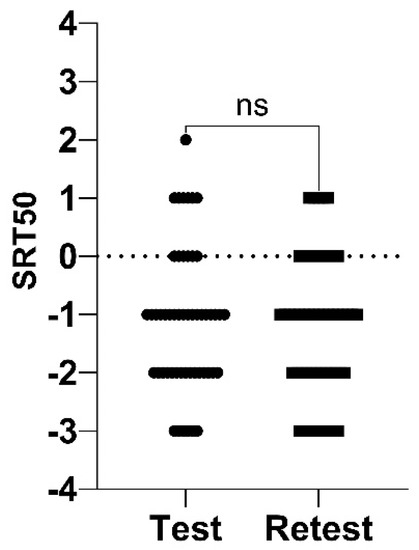 The mean SRT50 scores were obtained for each ear at test and retest. Since the variances were not statistically different and the distribution of the data followed a normal distribution according to the D’Agostino–Pearson test, the parameterized paired t-test was used. The results obtained in the right ear condition were not significantly different from those obtained in the left ear condition (p = 0.81 and p = 0.49 for test and retest, respectively; Table 1).