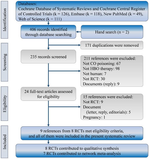 Our search yielded a total of 404 references in the Cochrane Database of Systematic review (including CENTRAL; k = 126), Embase (k = 118), New PubMed (k = 49), and Web of Science (k = 111). No further published RCTs could be found according to trial numbers in clinicaltrial.gov. Two more references were identified from reference lists of relevant systematic reviews. We excluded 382 of them because of duplicated references (k = 171), irrelevant references (k = 172), non-RCTs (k = 30), and documents (k = 9). Of the 24 references that remained for further review, we further excluded 15 for non-RCTs (k = 9), documents (k = 5), and a special population (k = 1). Finally, we included nine full-text publications from eight RCTs in this systematic review with network meta-analysis [2,11,12,13,14,15,25,26,27]. Figure 1 shows the flow diagram for evidence selection of HBO treatments in patients with CO poisoning.
