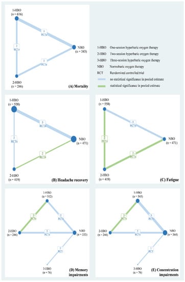 The eight studies of our meta-analysis included a total of 1785 patients with CO poisoning from Europe and North America between 1989 and 2002. Their mean age ranged from 31 years to 49.7 years and included 929 men (52.04%). Table 1 shows relevant information on the duration of CO exposure, CO level, and the numbers of patients in a coma at baseline. The quality of the included RCTs is presented in Table S1. Six of eight studies were low risk for other bias and incomplete outcome data. Five of eight RCTs were low risk for sequence generation, allocation concealment, and selective reporting. However, seven of eight had either a high risk or some concerns regarding participant and study personnel blinding. Based on the available data, we applied a three-node network model with NBO, one-session HBO, two-session HBO treatments for the mortality rate (Figure 2A), headache recovery rate (Figure 2B), and general fatigue rate (Figure 2C). A four-node consistency model with NBO, one-session HBO, two-session HBO, and three-session HBO treatments was applied for the memory impairment (Figure 2D) and difficulty concentrating (Figure 2E) rates.