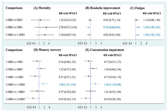 Four of the included trials (n = 1231) reported concentration impairments for NBO (n = 364), one-session HBO (n = 545), two-session HBO (n = 246), and three-session HBO (n = 76). No statistically significant differences were observed in concentration impairment among one-session (RR = 0.77), two-session (RR = 1.43), and three-session HBO (RR = 0.77) treatments compared with NBO (Figure 3E). Notably, two-session HBO treatment led to a higher rate of concentration impairment than the one-session HBO (RR = 1.85, 95% CI: 1.19 to 2.89). Although the three- and one-session HBOs (RR = 1.01) showed similar concentration impairment rates, the three-session HBO did not yield significantly lower rates of concentration impairment than two-session HBO treatment (RR = 0.54). SUCRA analysis again indicated that two-session HBO treatment was the worst treatment among the four interventions (Figure S12). The inconsistency test performed using the design-by-treatment interaction model showed no statistical significance in the network meta-analysis of concentration impairment (p = 0.866; Figure S13), and the Egger’s test also showed no significance in the consistency model of concentration impairment (p = 0.611), respectively (Figure S14).