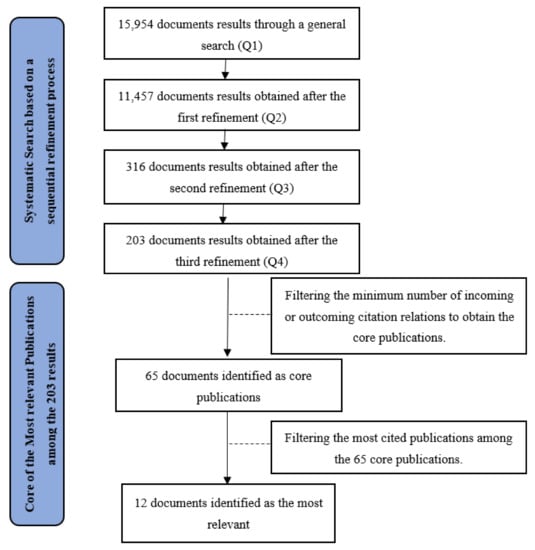 The Web of Science Systematic Search based on a sequential refinement procedure departed from 15,954 document results applying the general search query Q1. Then, 11,457 documents results were obtained after the first refinement applying the query string Q2, 316 documents results appeared after the second refinement applying the third query string Q3, and finally, 203 documents results were obtained after the third refinement applying the fourth query string Q4. From this point, we resort to the Core Publication Methodology of van Eck and Waltman [62], by filtering the minimum number of incoming or outcoming citation relations, resulting in 65 documents identified as core publications. Lastly, 12 documents were ranked as the most relevant based on their citation score. Figure 2 summarizes the systematic search.
