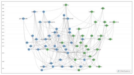 Full counting was applied as the citation counting method, which is the most common approach where each co-occurrence link has the same weight [62,228]. The total number of keywords for the red cluster is 232 (from 2 to 156 total link strength). This number for the green and blue clusters is 221 (from 2 to 143 total link strength) and 229 (from 2 to 175 total link strength). Table 5 reports the most recurrent keywords (with the minimum number of three occurrences for a keyword) for each cluster (see the keywords co-occurrence map visualizations in Figure 6, Figure 7 and Figure 8).