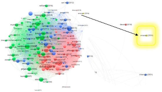 The blue cluster has 23 core publications out of 58 publications [16,29,31,34,41,43,44,47,48,53,60,63,66,67,69,70,79,80,84,88,90,92,93]. This cluster is about interesting frontier applications in hospital sectors and healthcare categories that are not usual in the field of hospital efficiency analysis. Some of the related applications are in sectors and healthcare services related to cardiovascular diseases, acute care, pharmacies, rural medical systems, laboratories, surgery, cancer screening, and pet cancer. The last (yellow) cluster refers to only one publication (Ancarani et al. [52]) about different religious perspectives and how they might impact the efficiency of hospitals.
