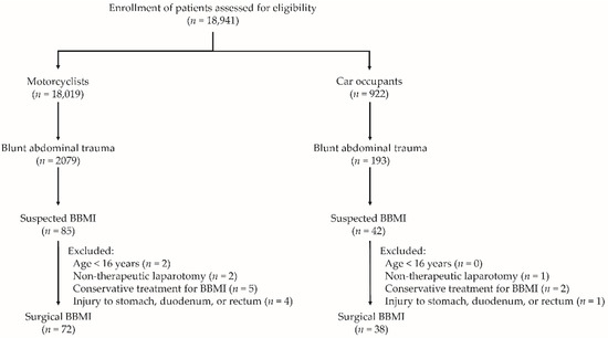 This study reviewed data from the Trauma Registry System from 1 January, 2009, to 31 December, 2020, in a 2686-bed level I trauma center that provides care to trauma patients in southern Taiwan [8,9,20]. All registered data recorded after trauma accidents were retrospectively collected and input into the hospital-based databank by two qualified nurses with specific responsibility for the integrity of the registered data [8,9,20]. Only motorcyclists and car occupants with BAT were included, whereas pedestrians involved in accidents or patients injured by causes other than motorcycle or car accidents were excluded. All patients (≥16 years of age) with surgical BBMI following BAT were surgically proven with small bowel, colon, or mesentery injuries. In total, 18,941 hospitalized patients were assessed. Among these, 18,019 motorcyclists and 922 car occupants were enrolled in this study (Figure 1). Of these, 2272 patients, including 2079 motorcyclists and 193 car occupants, had sustained BAT. There were 85 motorcyclists and 42 car occupants with suspected BBMI. After excluding those aged <16 years and who had received nontherapeutic laparotomy—conservative treatment for BBMI—and injury to the stomach, duodenum, or rectum during laparotomy, data from 72 motorcyclists and 38 car occupants who sustained surgical BBMI were eligible for further analysis.